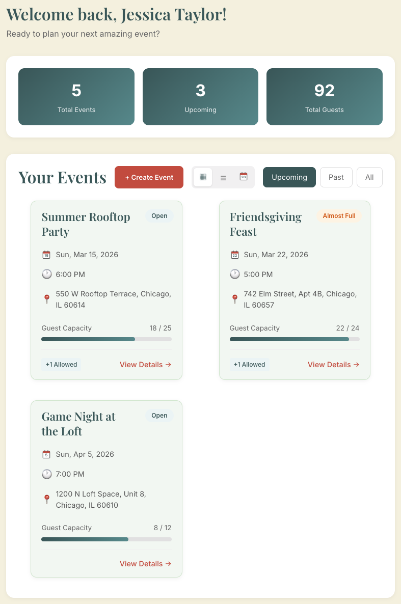 See every gathering at a glance — upcoming dates, guest counts, and how fast spots are filling. Whether you're running one dinner party or a whole season of events, your dashboard keeps everything organized without a single spreadsheet.