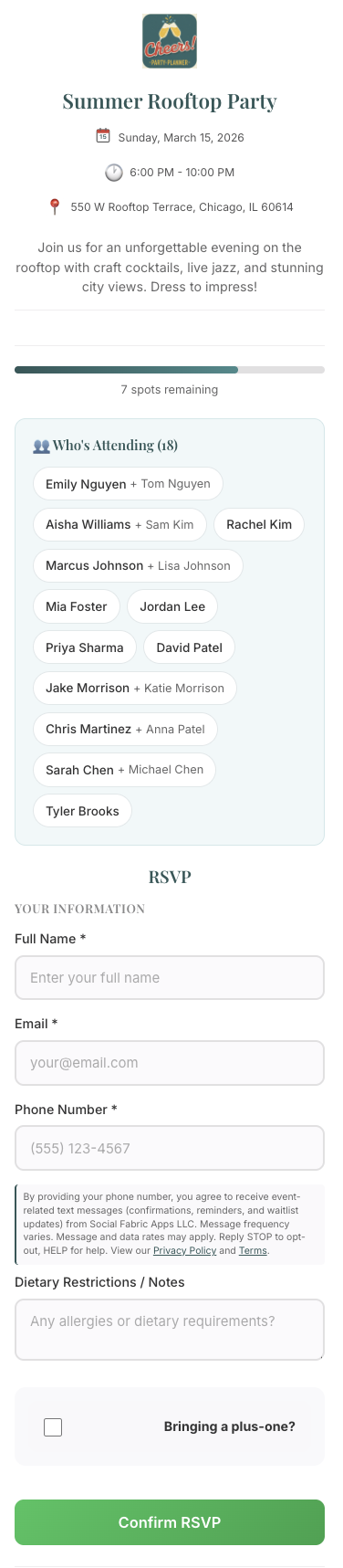 Guests get a clean link — no app to download, no account to create. They see who else is coming, fill in their info, and confirm. Done. You get an updated headcount instantly.