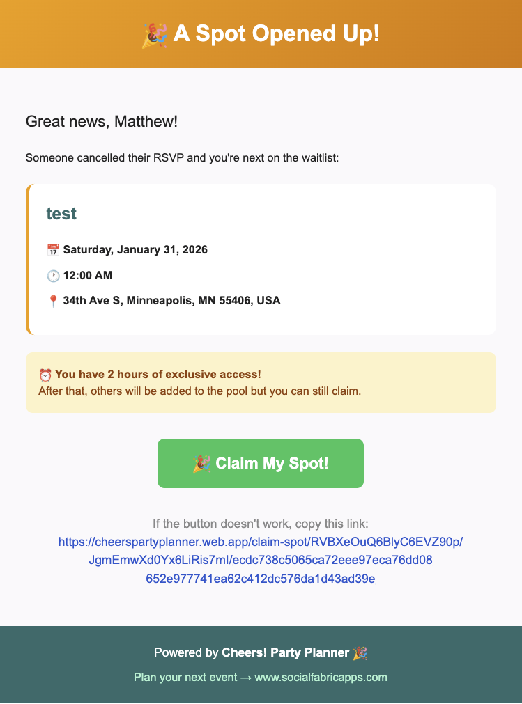 When someone cancels, the next person on your waitlist gets notified automatically — by email and text. They have two hours to claim the spot before it moves to the next guest. You don't have to lift a finger.