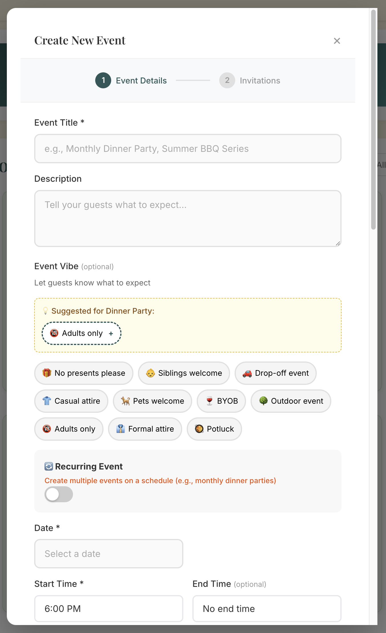Creating an event takes about two minutes. Add your details, set the capacity, and tag the vibe — BYOB, potluck, adults only, whatever fits. Guests know what to expect before they even RSVP.