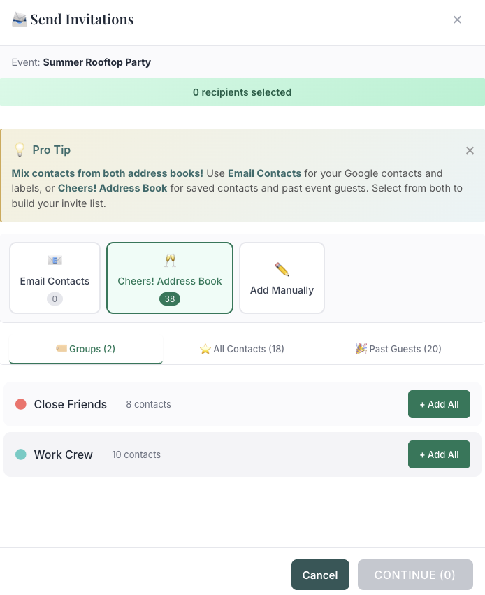 Pull from your Google contacts, your Cheers address book, or past guest lists. Select a group, hit send, and everyone gets a personal invitation. No awkward group texts. No one left off the list.
